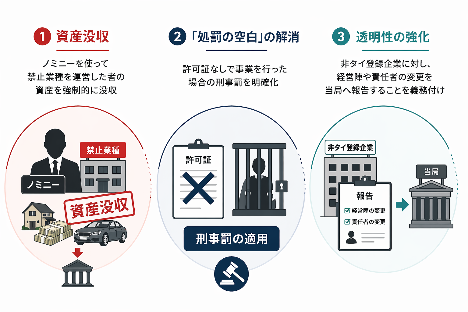 「処罰の空白」の解消:許可証なしで事業を行った場合の刑事罰を明確化(これまでは訴追に必要な法的根拠が不足していた)