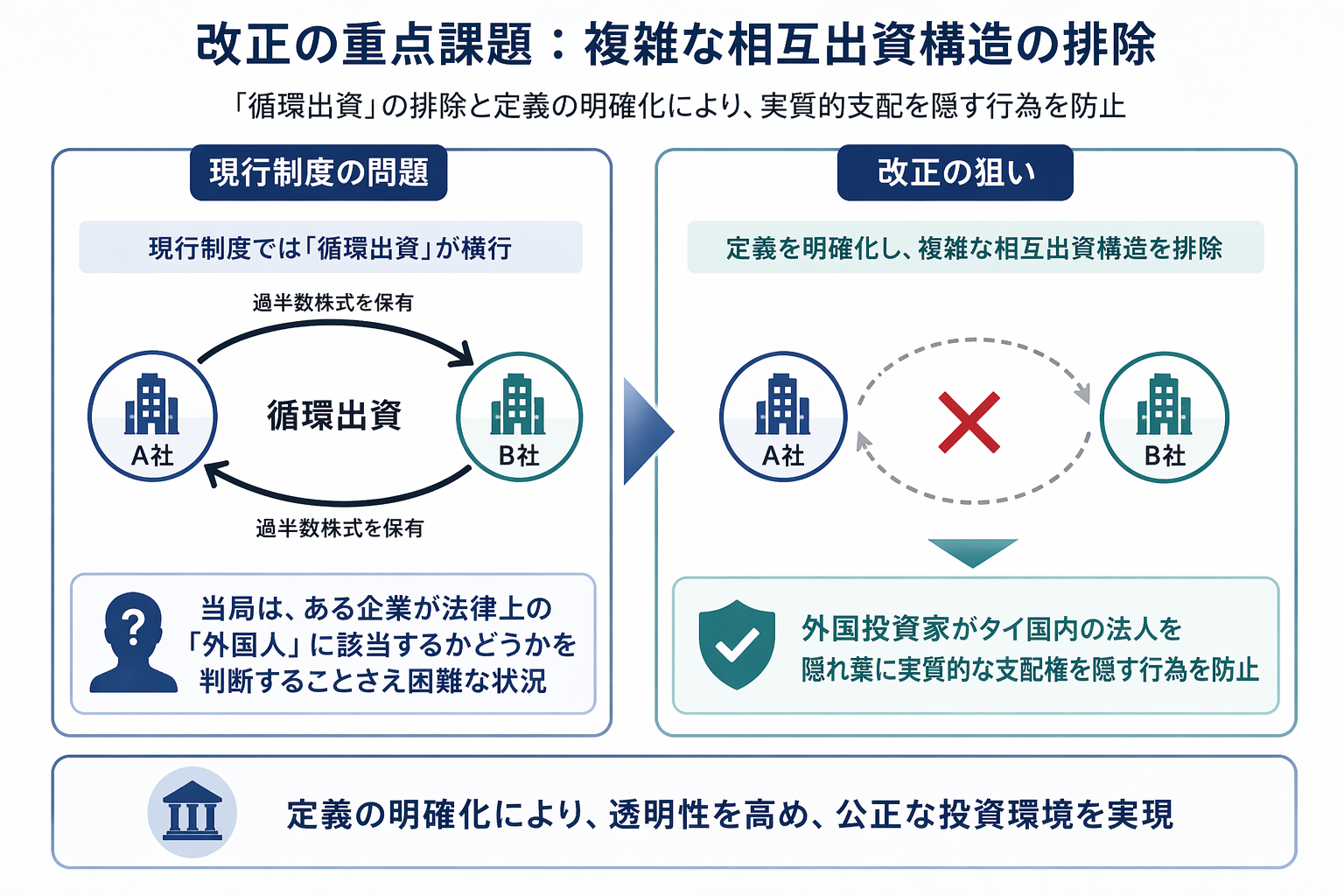 改正の重点課題の一つが、複雑な相互出資構造の排除だ。現行制度では、A社がB社の過半数株式を保有し、B社が再びA社の過半数を保有する「循環出資」が横行しており、当局はある企業が法律上の「外国人」に該当するかどうかを判断することさえ困難な状況に置かれている。この定義を明確化することで、外国投資家がタイ国内の法人を隠れ蓑に実質的な支配権を隠す行為を防ぐ狙いがある。
