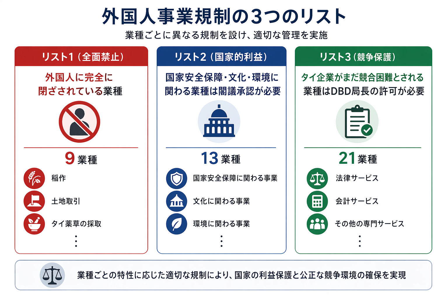 リスト1(全面禁止)は稲作・土地取引・タイ薬草の採取など9業種で外国人に完全に閉ざされている。