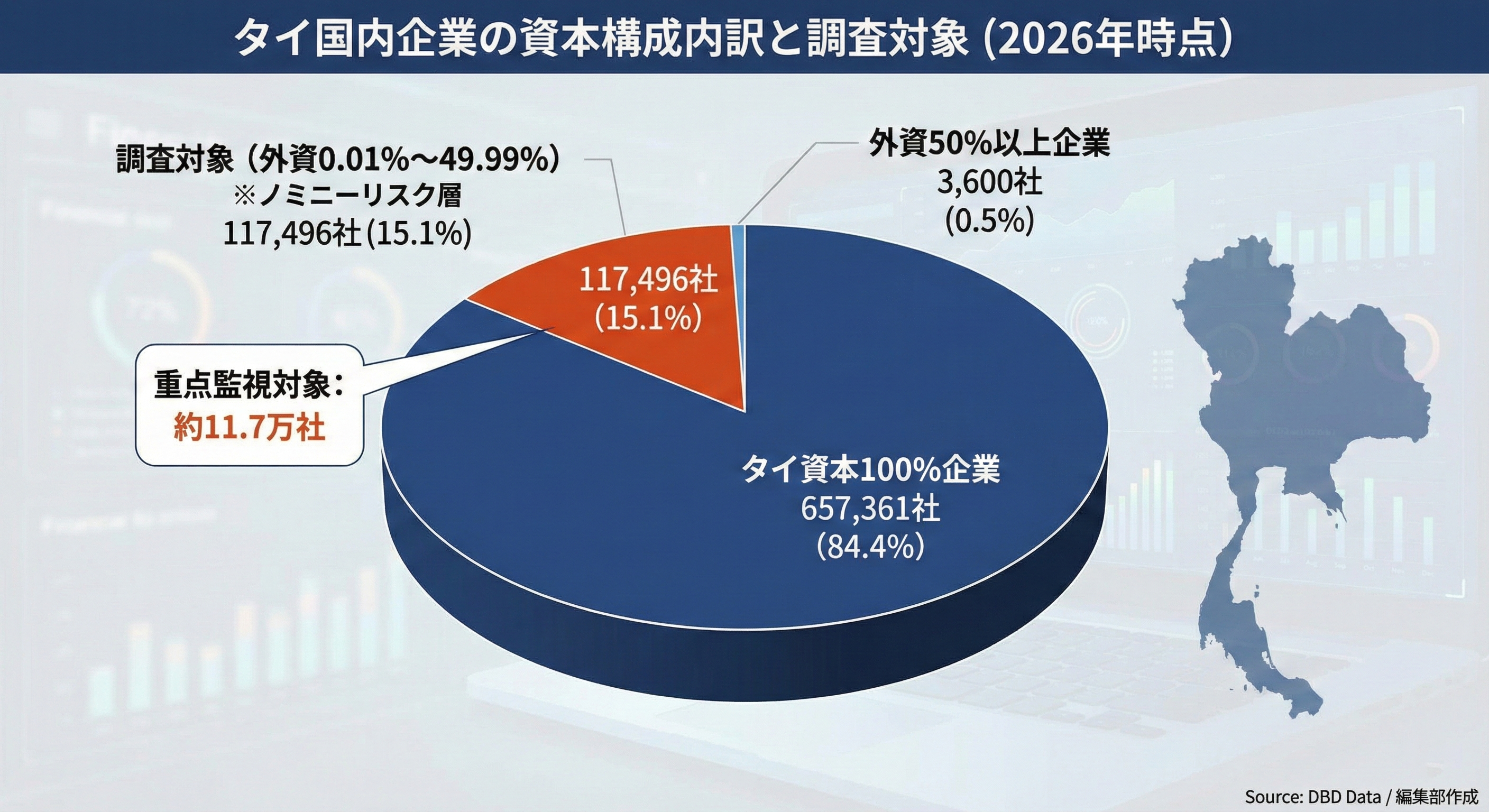 DBDのプーンポン・ナイヤナパコーン局長によると、2026年時点でタイ国内で稼働している企業は計77万8,457社。そのうち外資が出資する企業は12万1,096社に上る。今回の調査では、特に外資比率が0.01%から49.99%の間で、タイ人が名義上の筆頭株主となっている可能性が高い約11万7,496社を精査する方針だ。