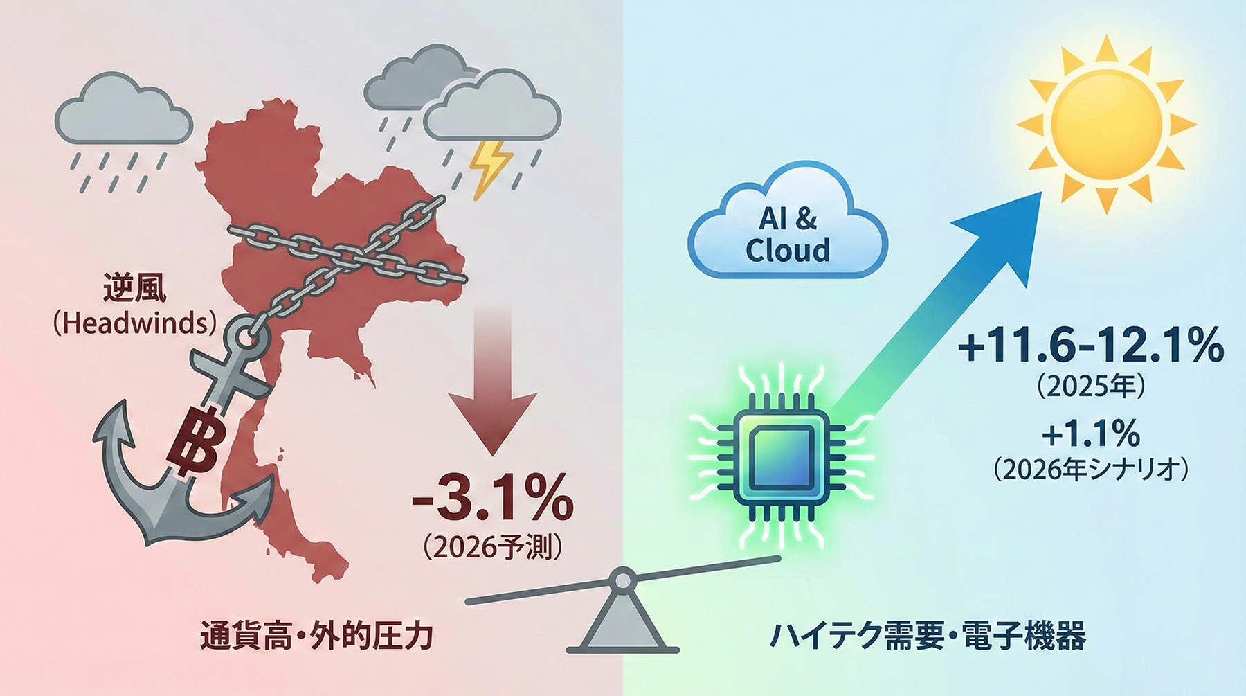 タイ商務省の貿易政策・戦略事務局(TPSO)は、2026年の輸出見通しについて、3.1%の減少から1.1%の増加という極めて広範な予測を公表した。世界経済の減速や地政学的リスクが影を落とす中、タイ経済の柱である輸出セクターは、再来年に向けて厳しい局面に立たされる可能性がある。