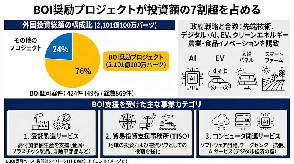 投資の大部分は、タイ投資委員会(BOI)の奨励プロジェクトに関連している。認可された869件のうち49%にあたる424件がBOIのインセンティブに関連しており、その投資額は2,101億100万バーツと、外国人投資総額の76%を占めた。