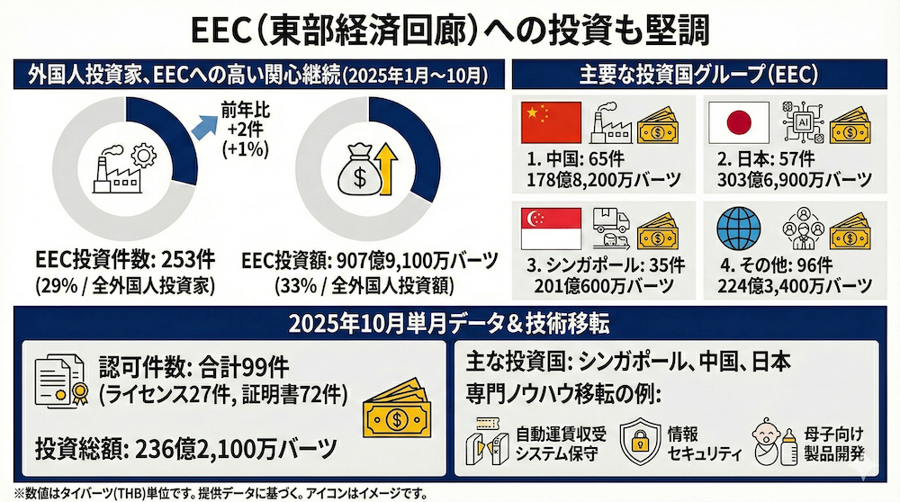 なお、2025年10月単月では、合計99件の外国企業が認可され(ライセンス27件、証明書72件)、投資総額は236億2,100万バーツであった。