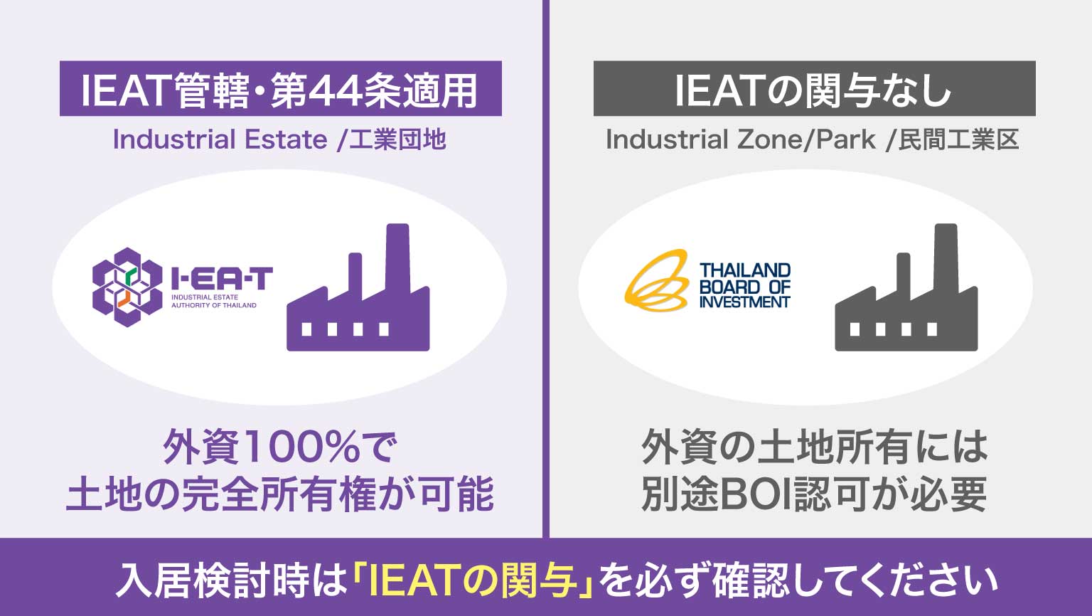 「工業団地」という名称がついていても、IEATが管理・関与していない民間の工業区ではこの特権は適用されません。入居を検討する際は契約書・公式登録情報でIEATの関与を必ず確認してください。 弊社で配布している工業団地マップで紫色の文字の工業団地はIEAT工業団地です。 |