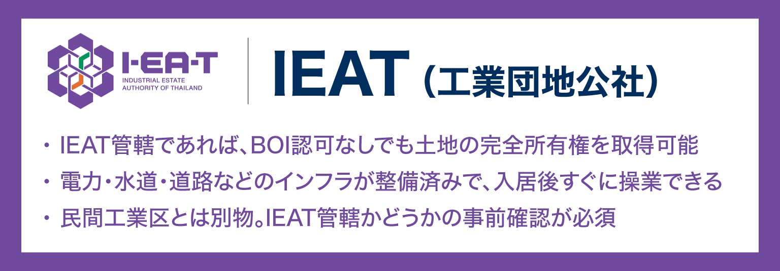 - IEAT(タイ工業団地公社)が管理する工業団地内の土地に入居する(工業団地公社法第44条)