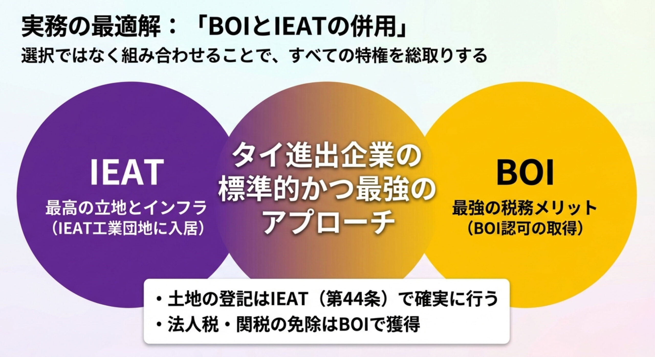 実務上の原則:BOIとIEATは「併用」が基本 IEATの工業団地に入居 + BOIの認可を同時に取得することで、土地所有権・法人税減免・関税免除のすべてを確保できます。どちらか一方だけでは得られないメリットを組み合わせるのが、タイ進出企業の標準的なアプローチです。 |