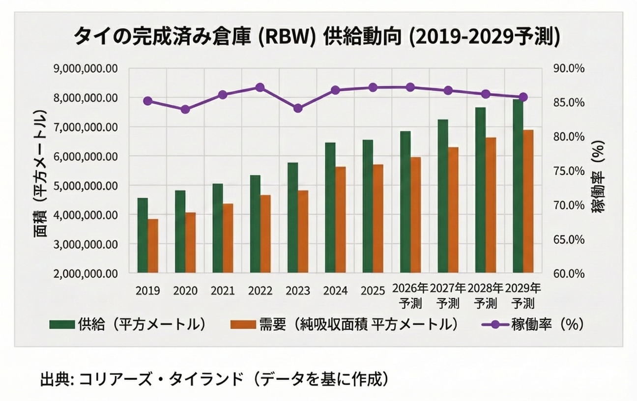 過去5年間で、タイにおける近代的倉庫ストックは、新型コロナウイルス流行前のおよそ500万平方メートルから、現在では640万平方メートル超へと増加した。完成済み倉庫は、テナントおよび投資家双方のニーズに対応できる点が評価され、以下の要因が需要拡大を後押ししている。
